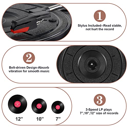 3-Speed Vinyl Player for 3-Size: It supports 33 1/3, 45, 78RPM with 7" 10" 12" sizes, And 45RPM adapter is included.